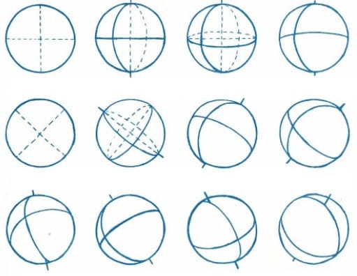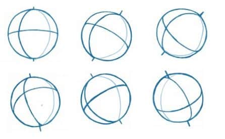 Les lignes en pointillés montrent les parties cachées de la sphère. Rassurez-vous si vos premiers cercles ressemblent à des œufs tordus : avec de la répétition, vos sphères prendront forme. Dessiner des centaines de cercles, c’est le meilleur échauffement possible avant chaque session. Accordez-vous au moins dix minutes à cet exercice, que vous soyez débutant ou déjà confirmé. Vous verrez la différence sur la souplesse de votre trait.